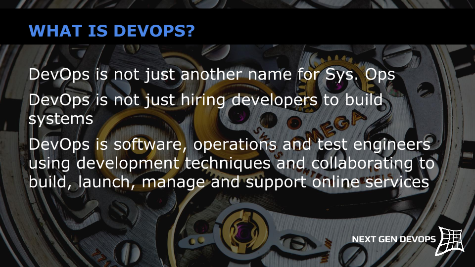 Yes, yes this is the obligatory “What is DevOps slide” but in this case this slide gave me the opportunity to convey a specific message to the recruiters in the room. This message was pushed further by Ken Ward and Matt Buckland later in the evening. Recruiters are in a position of great power and responsibility and unlike Spiderman they don’t have to just whinge and cry about things like an angsty teenager. Recruiters have a huge influence over the attitude and culture of an organisation because they present candidates for interview. If their CTO is asking for DevOps people the recruiters are in a position to find out whether the organisation is really ready fro DevOps or whether the CTO just thinks DevOps is the latest name for System Administrators.