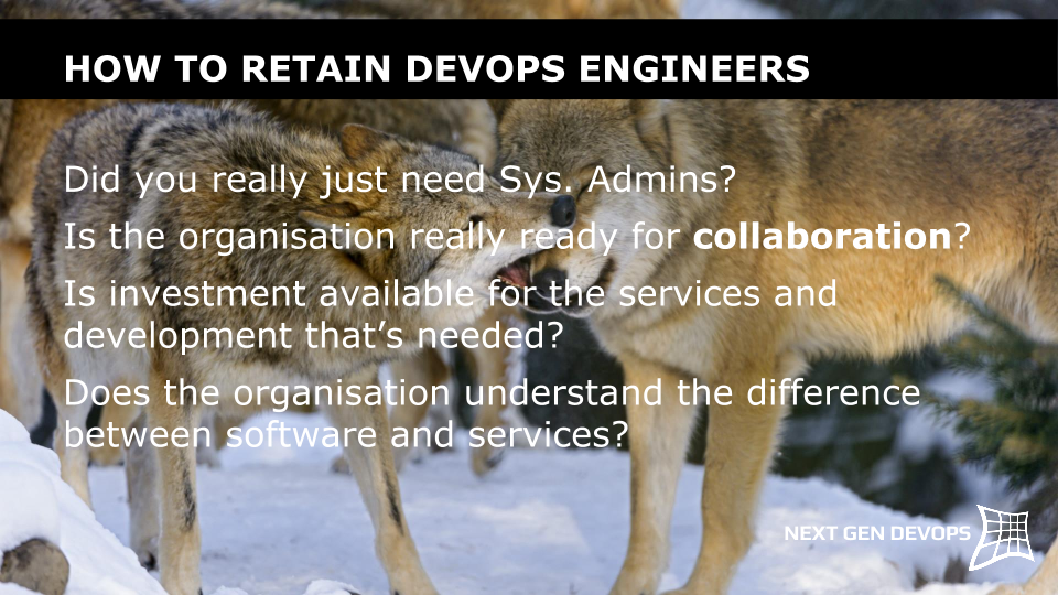 In almost every example the issue comes down to organisations not understanding that without collaboration there is no DevOps. Organisations that attempt to bolt a DevOps team onto their current organisation can only fail and make everyone miserable along the way. Creating a DevOps team to manage deployment automation while software engineers continue to design services with no input from the people responsible for operating or testing them just doesn’t work. Oh sure you’ll get away with it for a while but the approach you used to build software is not the approach you need to build a service. Services live they don’t just launch, they need support and management and optimisation. This isn’t done by presenting different challenges and incentives to different teams of people with different skill-sets and experiences. Online services flourish when talented engineers with different knowledge and experience work together to design, build, launch, manage and support services. Nothing is more inspiring or motivational than being part of team of talented and passionate engineers all focused on the same goals. If your organisation pays well, encourages real collaboration and hires talented people you will have no retention problems.