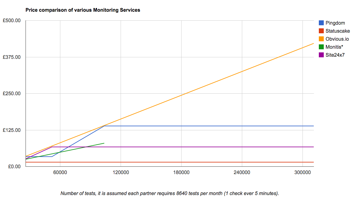 Offer a really good fit. The pricing might be artificially low because their £14.99 price point only offers 25 SMS’s and while I don’t expect many failures I can see that being consumed really quickly if we make a mistake implementing a new project. Upgrading to £49.99 per month would then provide unlimited SMS and more test locations and being Statuscake’s price more in-line with some of the other providers in this assessment. However the £14.99 price point is very tempting for the early days of the project.