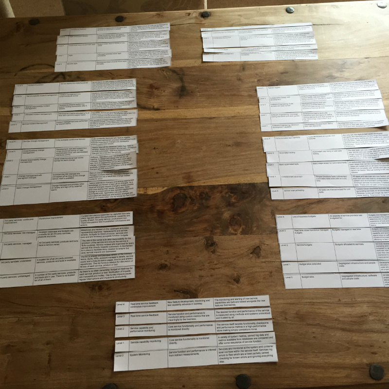 The framework takes each one of these functions through a series of steps (projects) which improve the capability and productivity of each function. Yesterday I submitted them to the first test process. I wanted to make sure that while each step might refer to other steps preceding it or assume capabilities in other functions at the same level they didn’t assume any capabilities only available at later levels. I did this in a distinctly old school way. I printed them all out, cut them up and laid out the starting point or capability level 0 as I’m calling it at the moment. This effectively defines the prerequisites for starting a DevOps transformation. I’ll publish more on that later. Framework_lvl_0 I then randomly selected capabilities from the next level (level 1 funnily enough) and made sure nothing was assumed that wasn’t already present and continued until I had laid out all the capabilities for each function. framework_lvl_4